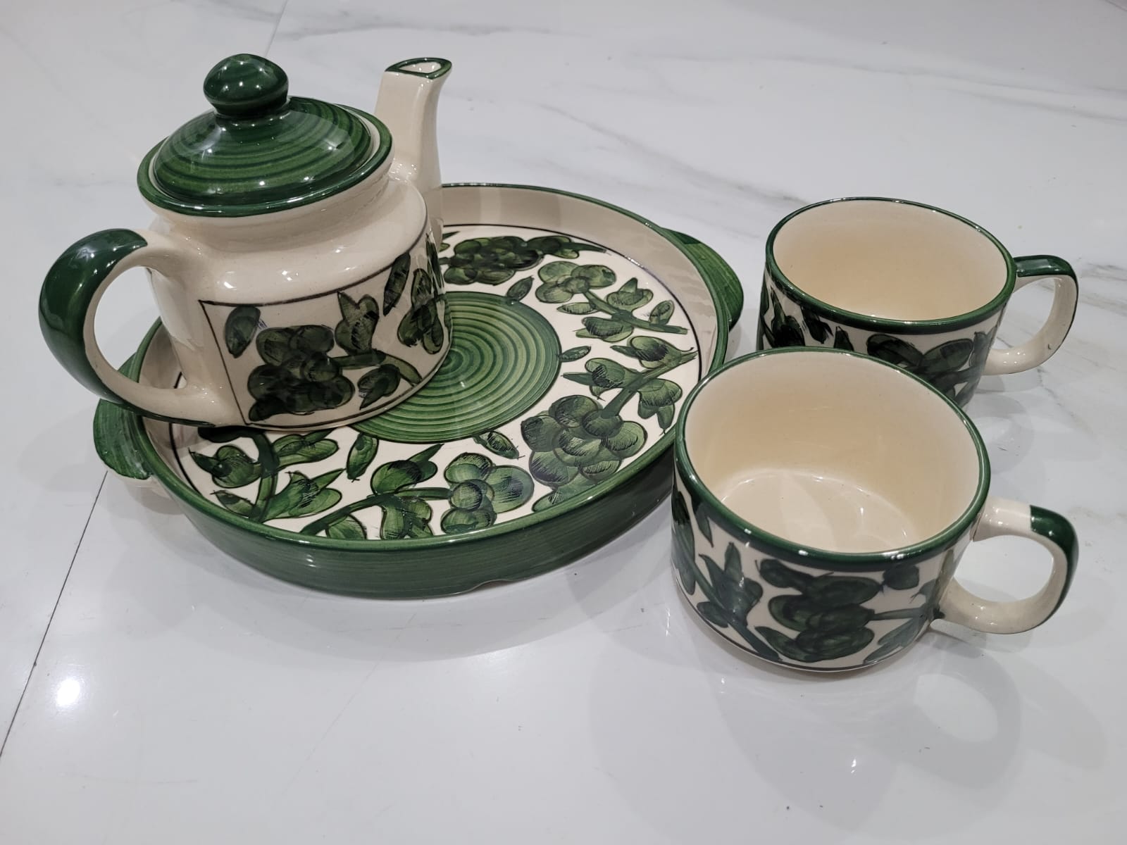 Perfect for cozy tea sessions or as a thoughtful gift, the set includes a ceramic teapot, two matching cups, and a serving tray — all featuring a soothing blend of ivory glaze and hand-detailed green foliage motifs. The sturdy handles and smooth finish ensure comfort and durability, making every sip a delightful experience.